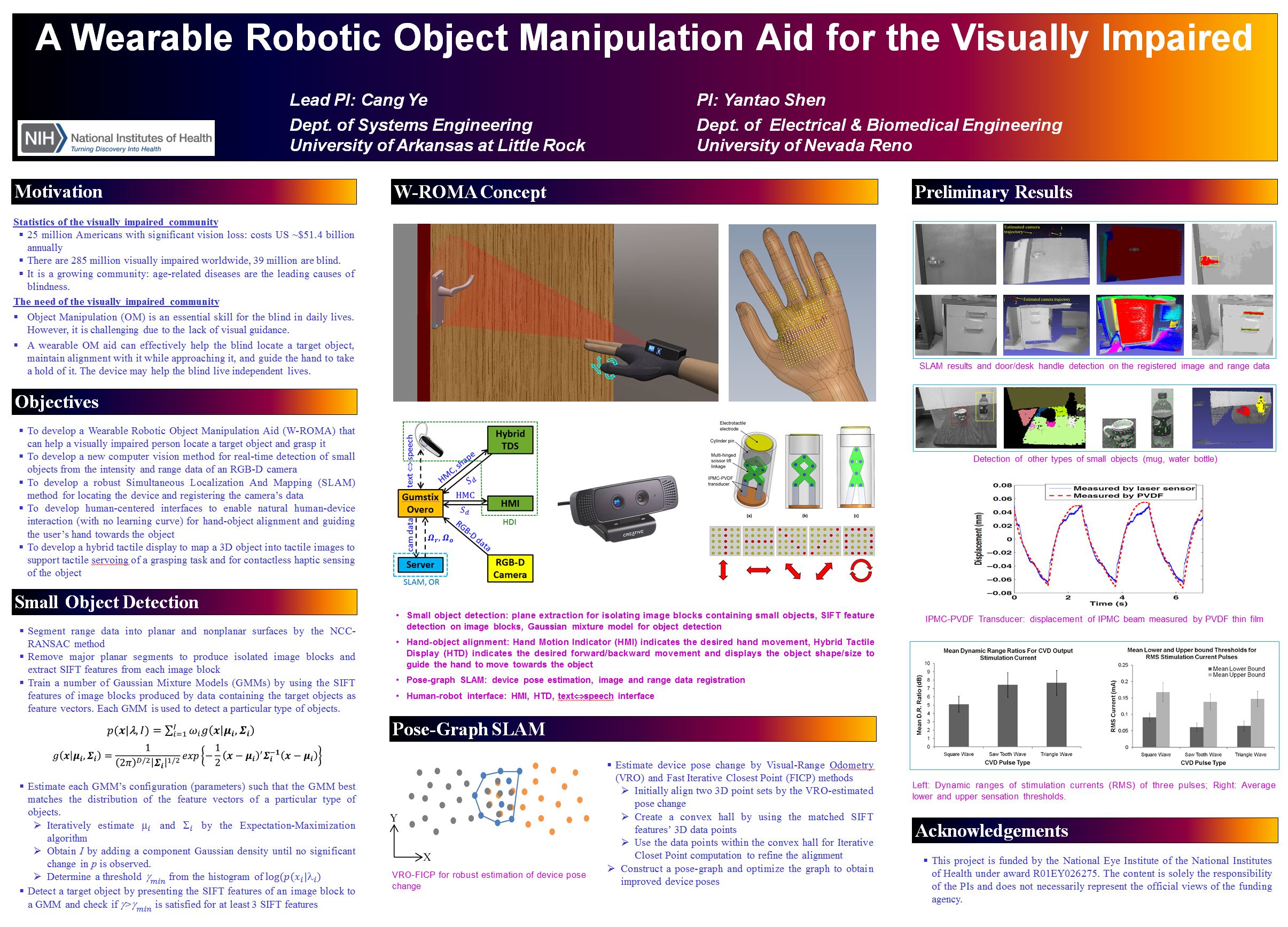 The project’s goal is to develop a Wearable Robotic Object Manipulation Aid (W-ROMA) that can help a visually impaired individual locate a target object and manipulate the object as needed. The hand-worn assistive device uses an RGB-D camera to detect the target object and determines hand-object misalignment. It then conveys to the user the needed hand movement by using an intuitive human-device interface for object alignment and effective grasping. The device can ease an object manipulation task by guiding the person’s hand towards a target object. This is a collaborative research project with Dr. Yantao Shen at University of Nevada Reno.