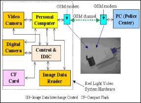The purpose of this project is to provide an alternative red light runner detecting technique. The existing detecting systems use buried loops hence require road works when installing the systems in urban transportation systems. The RLVS employs video processing technology to detect red light runner, and transfer the offenders’ pictures to police centers through a GSM channel. The following figure depicts the diagram of the RLVS. The aim of this circuit is to provide a high-speed channel to transfer the image data from the digital camera to the personal computer, and offer a control port to operate the digital camera and the video camera. When I designed the RLVS, the commercially available digital camera only supports slow serial data transmission which can’t meet the requirement that the digital camera may continuously take snap shorts. The RLVS uses ECP parallel port. Therefore, it is able to transfer the image data from the Compact Flash Card to the personal computer at more than 1M bytes per second.