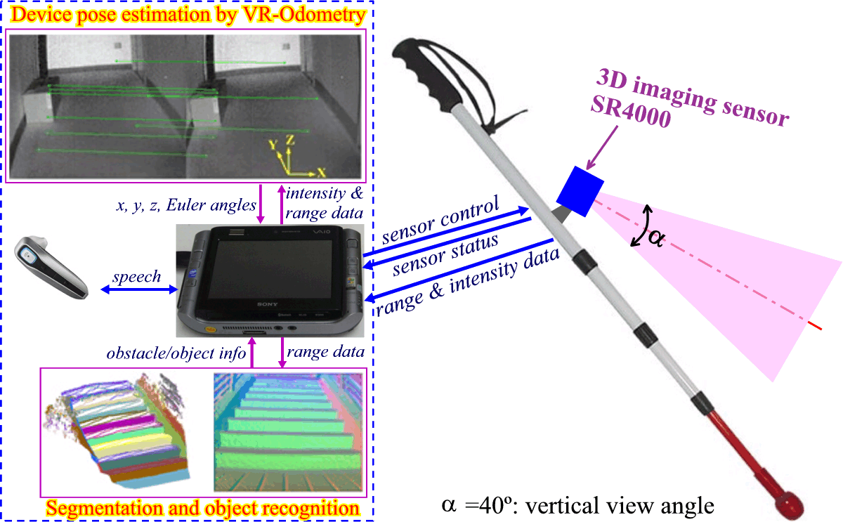 Funded by a grant from the Robust Intelligence Program of the National Science Foundation, the project's objective is to devise computer vision methods to enhance the navigation functions of a white cane for the visually impaired. The computer vision enhanced cane is called a smart cane. The enhanced navigation functions include device positioning (as a result a 6-DOF device pose estimation), object recognition and obstacle detection. Some objects such as a stairway or a doorway may be used as waypoint to access/exit a room or get to the next floor and make a navigation task easier.