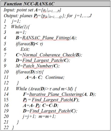 We proposed a so-called NCC-RANSAC method to segment a scene (3D point-cloud) into planar surface for object/ scene recognition.